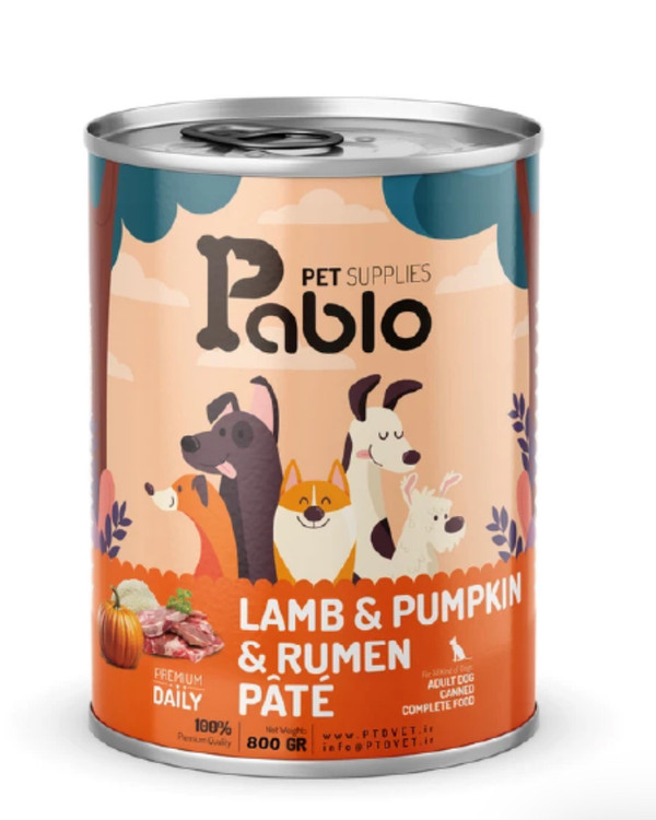 کنسرو پته سگ بالغ پابلو طعم گوشت بره و کدوحلوایی و سیرابی وزن 400گرم